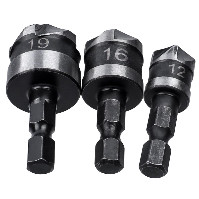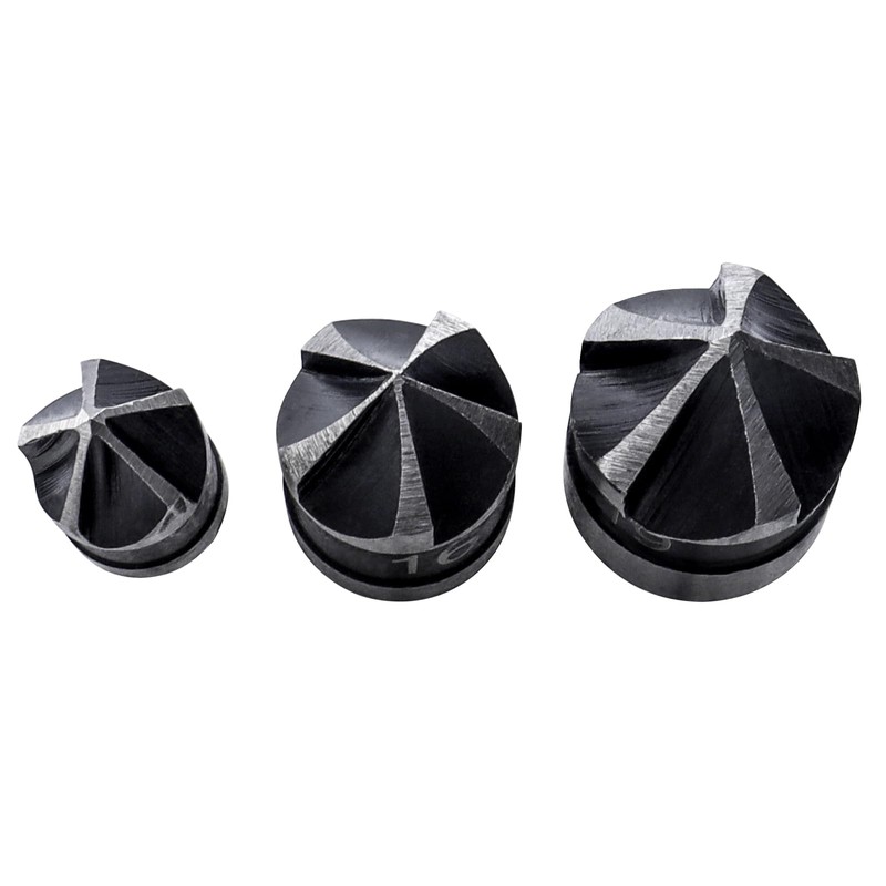 - 3-piece set of chamfered cutters, 0.25 inch (6.35 mm) shaft diameters, 3 sizes (0.57 inch (12 mm), 16 mm, 19 mm)