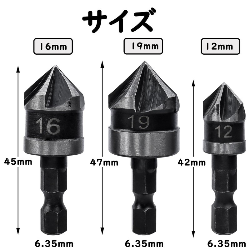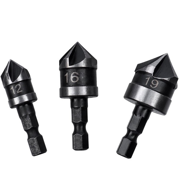 Bestgle Countersunk Drill Chamfer Cutter Bit Set of 3 Countersinks, Countersinks, Countersink Deburring, Punching Cones, Hexagonal Shaft Drill Bit, Electric Drill Set, 0.5 inch (12 mm), 0.6 inch (16 mm), 0.7 inch (19 mm)