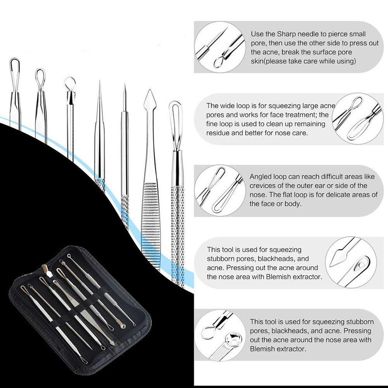 - 10 in 1 extractors instruments kit like pullers and pushers which can easily remove blackheads, comedowns, acne and other facial impurities. Good for its purpose for treating pimples, facial impurities and blemishes