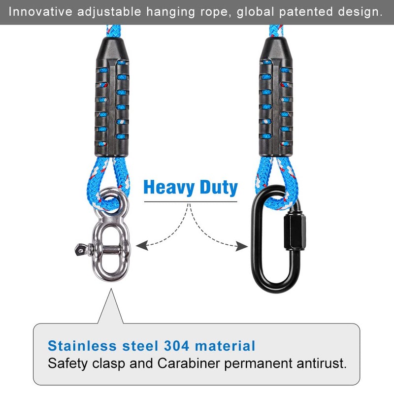 - EASY TO USE:Need't any other hardware, easily hang any swing to tree or play set. First: Hanging usage, just throw it over a tree or beam and attach the hooks to your swing or patio furniture; Second: Adjustable usage, open the safety clasp, pass the rope through the metal buckle, locked up then pull the rope ends tight.