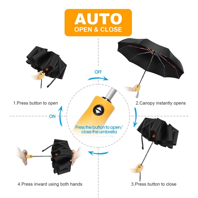 - ☔☔ AUTOMATIC, COMPACT, AND LIGHTWEIGHT - Auto open/close function allows for easy one-handed operation. Measuring just 31cm long and weighing less than 450g the folding handheld umbrella is extremely packable in purses, briefcases, backpacks, luggage and more
