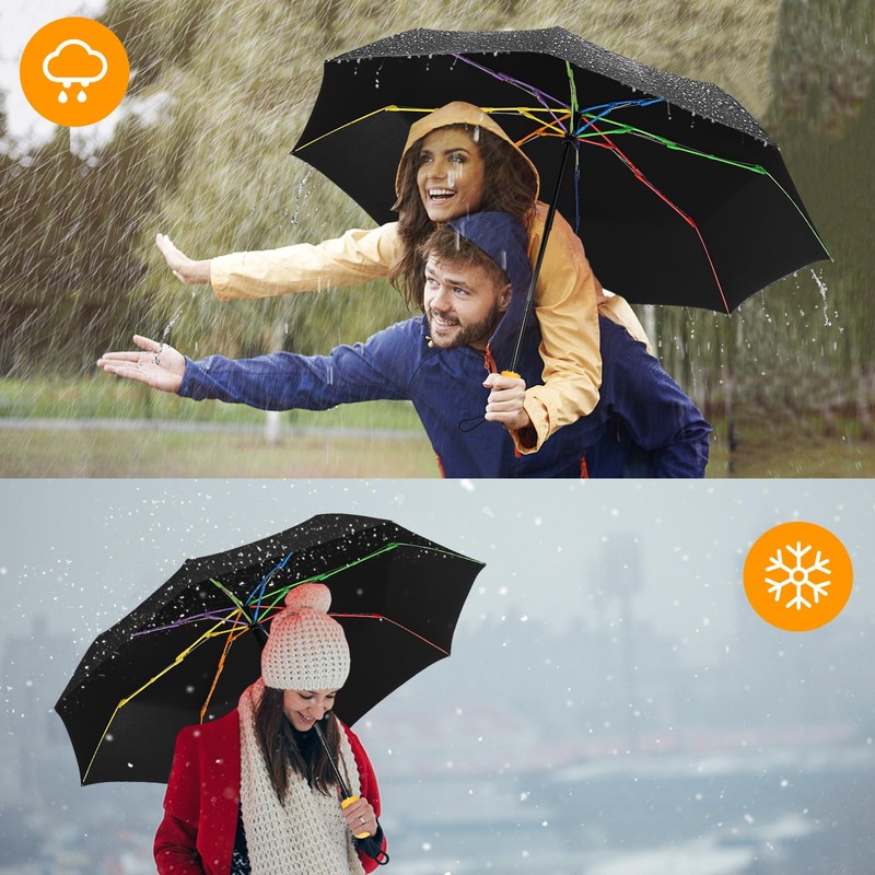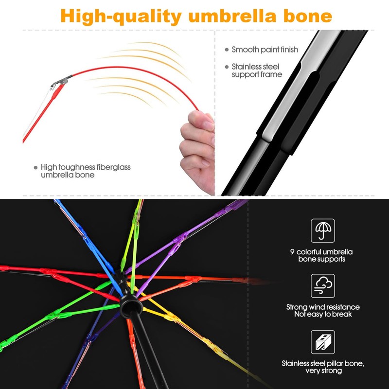 - ☔☔ Unique Rainbow Ribs Design - 9 reinforced colored ribs with sturdy all frame and shaft make the canopy highly wind resistant for storms and the harsh outdoors. Our folding umbrella is compact, light weight, stylish and durable for the best quality weather protection.
