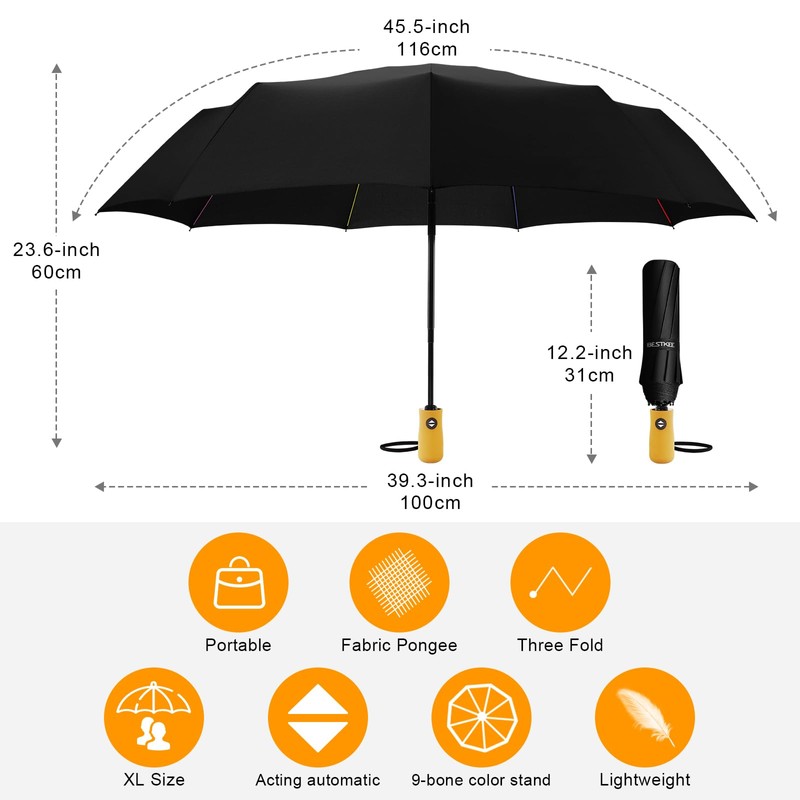 BESTKEE Windproof Travel Folding Umbrella Automatic, Large Rain Folding Compact Umbrella Portable Fast Drying with Auto Open/Close Button, Non-slip Handle (Black)
