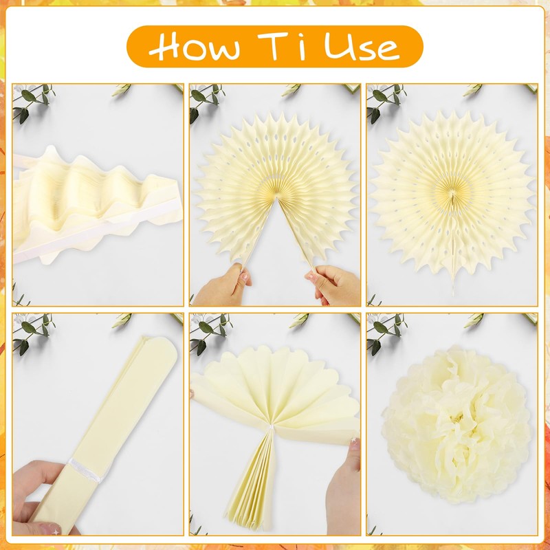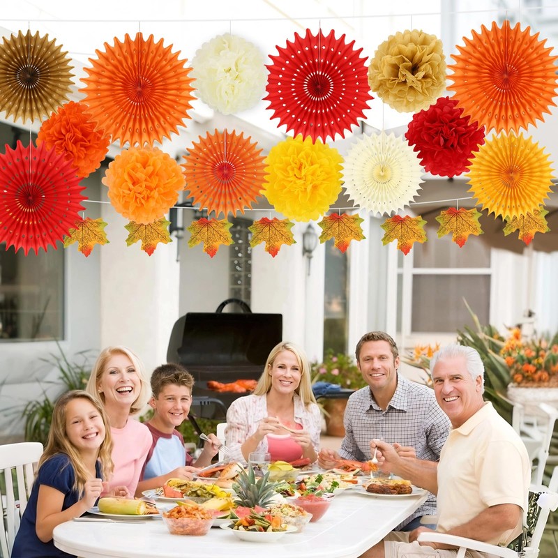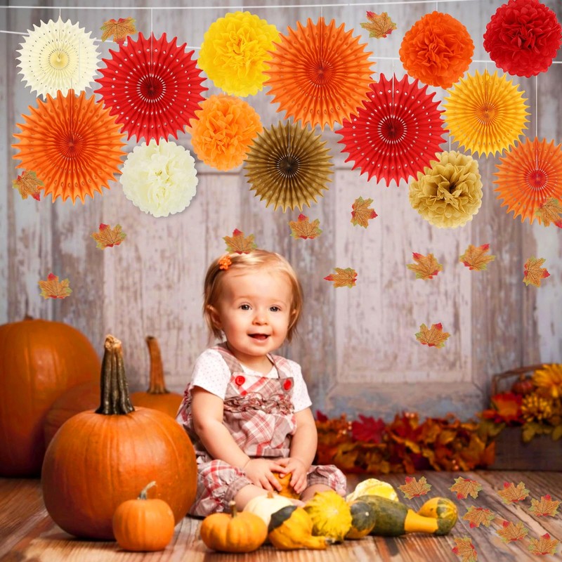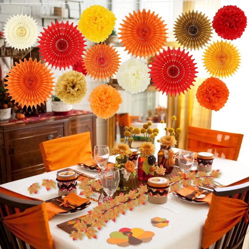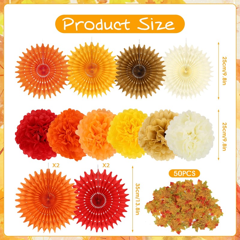 - BestoFun Pack of 15 Autumn Orange Red Pompoms Paper Fan Decoration