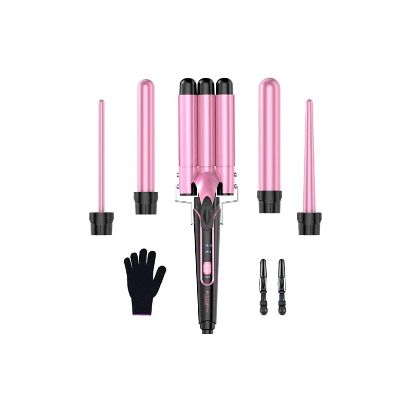 BESTOPE PRO Lockenstab set 5 in 1 Welleneisen - Lockenstäbe 3 Fässer für Große Keine Locken Keramik Lockenwickler mit Verschiedenen Aufsätzen mit Handschuh und 2 Clips