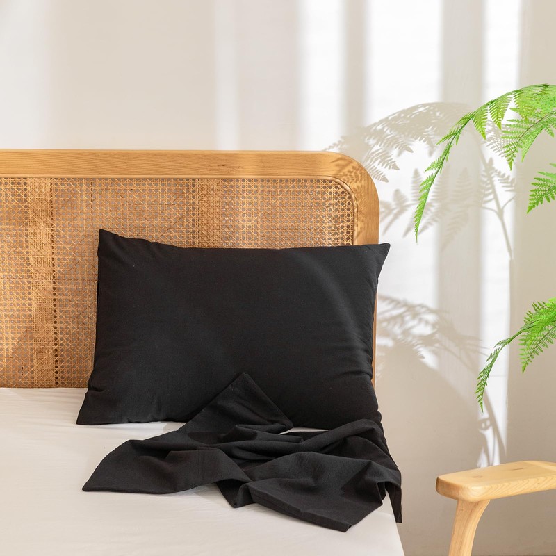 BESTOUCH 100% Washed Cotton Pillowcase for Hair and Skin Linen Feel Soft Comfortable Breathable 2 Set Pillow Case with Envelope Closure Solid Deep Dark Black Queen 20x30 Inches