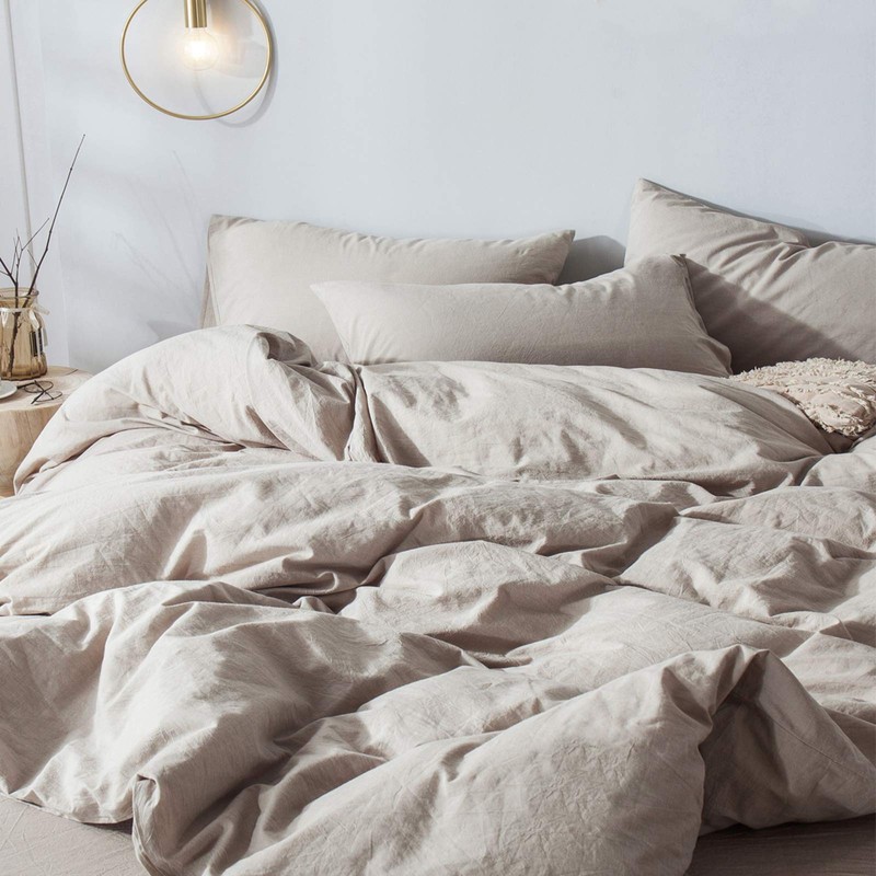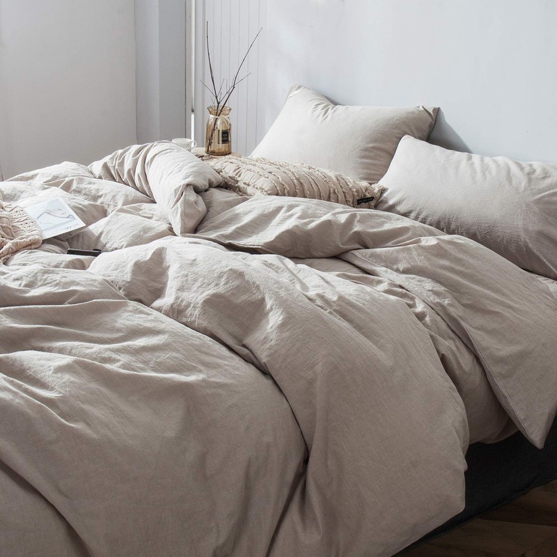 - Material: 100% washed cotton, slightly wrinkled look, great linen feel. If you want a linen style bedding, this duvet cover set is beautiful and perfect! The fabric is so soft yet with a very light crispness to it, even after washing, and it will get softer with each wash. It's like sleeping in a cloud.