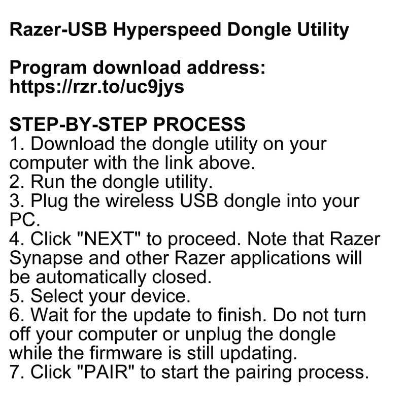 • Note: Please search Razer USB Hyperspeed Dongle Utility and download this program, insert the receiver to pair with the mouse. For detailed steps, please refer to the Second product image.