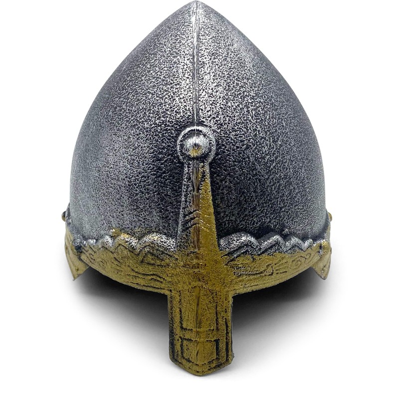 Equip your young archers with this kids' archery style plastic knight helmet. The surface of the helmet is rough and silver, with gold embellishments that give it an impressive look. The helmet has the typical shape with a nose guard to ensure the authentic look of an archer. With a solid build and a light weight of 125 grams, this helmet is comfortable and practical for young archers who need a helmet to complete their archery adventure.