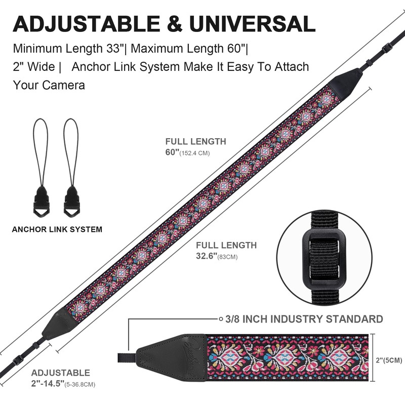 - ✔︎【Adjustable】This camera strap has a wide range of adjustments (33-60 inches), it can be adjusted as needed and worn around the neck, body or over one shoulder. Whether you are looking for something for yourself or a gift for the favourite photographer in your life, you can't go wrong with this unique and comfortable camera strap! It is the best photography gift for professional or amateur photographers.