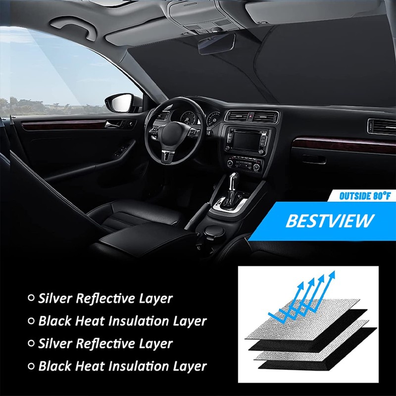 - đăSturdy Materială:Bestview windshield sunshade is made of 210T polyester fabric with UV reflective material, 3 layers of heat insulation, 99% sun protection index, and better heat dissipation. Designed to protect car seats, electronic components, dashboards, steering wheels and other instruments to keep them cool and fully shaded from the sun, so there is no need to worry about high temperatures in summer.