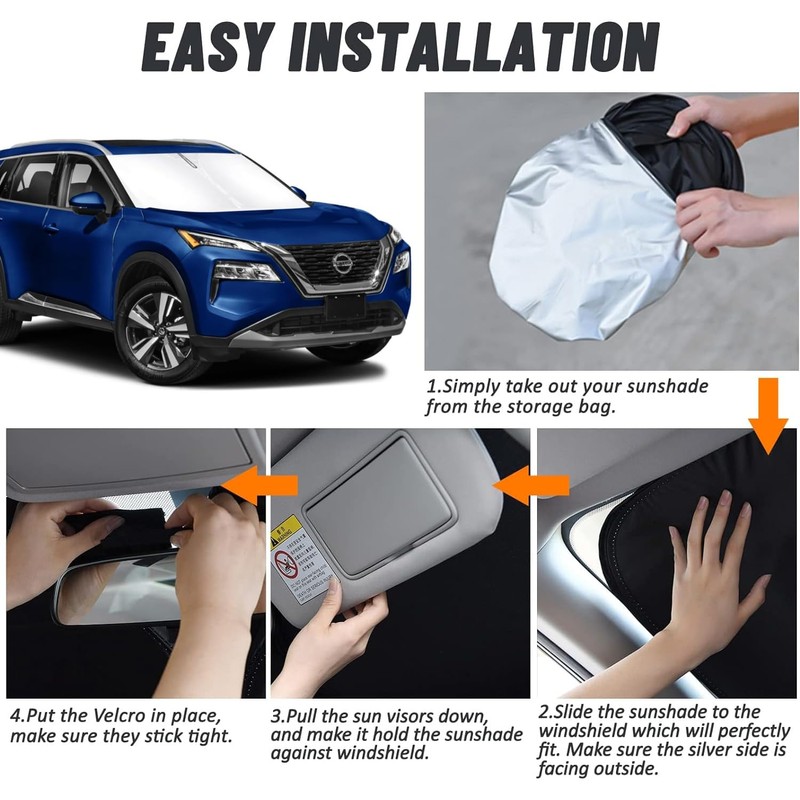 - đăCustomized Windshield Sun Shadeă: Front windshield sunshade for Nissan Rogue 3rd Gen 2021 2022 2023 2024 2025. 3-layer design including black heat insulation layers and silver reflective layers, custom-fit sunshade to full cover your windshield.