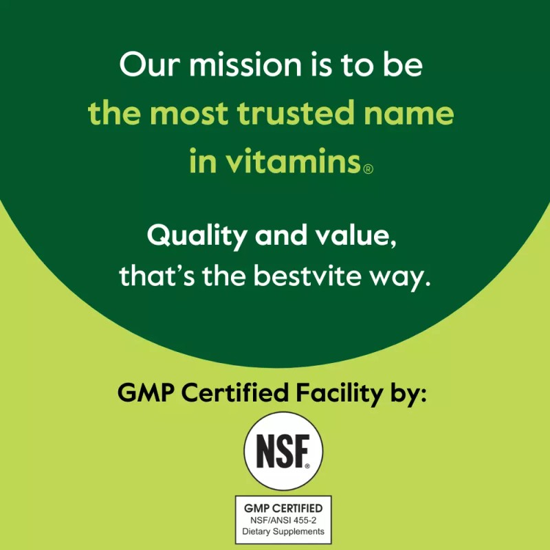 NSF GMP CERTIFIED FACILITY: Bestvite’s facility is NSF/ANSI 455-2 Dietary Supplements Good Manufacturing Practice (GMP) certified. Earning GMP certification from NSF verifies that a manufacturing facility has the proper methods, equipment, facilities, and controls in place to produce dietary supplement products.