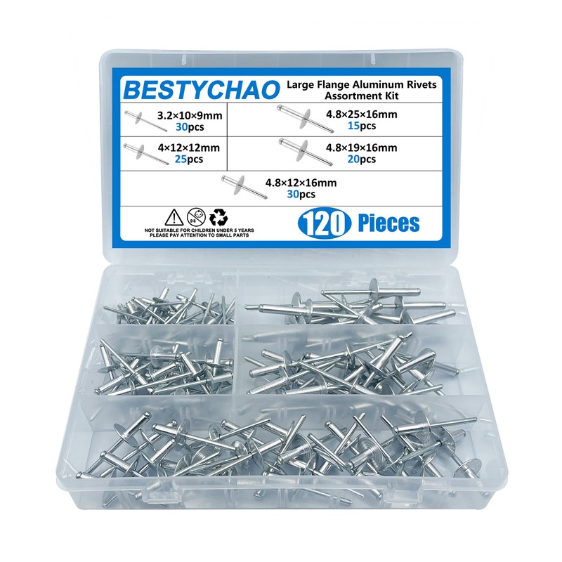 BESTYCHAO Pop Rivets, 120pcs 5 Sizes Large Flange Aluminum Blind Rivets Assortment Kit(Silver)
