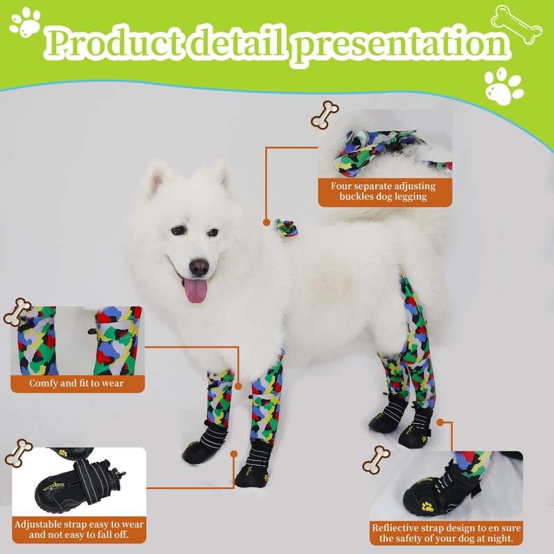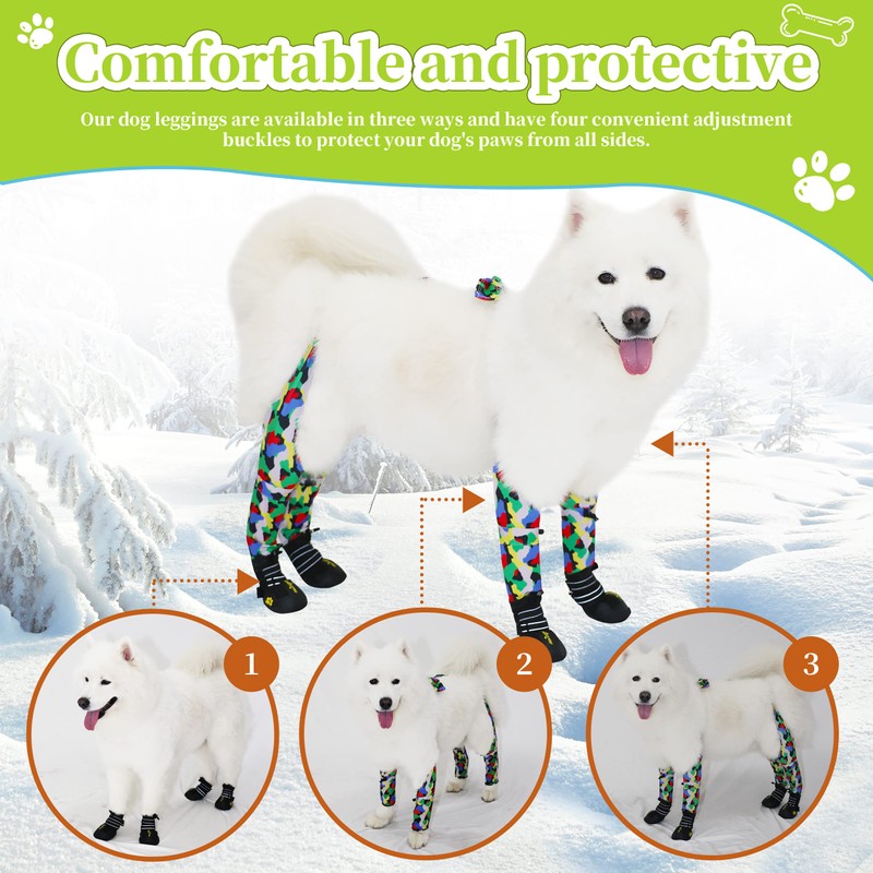 - COMFORTABLE : This dog legging have three functions, it can be used as a shoe alone, as a dog pant, and can be worn together.Adjustable dog legging has over-to-back design fixed the leggings in place, The Legging has four adjustable buckles for easy on and off to match the shape of your dog's natural legs. this dog leggings with boots can be adjusted in size and disassembled for cleaning according to the different height and weight of dogs and will not inhibit the movement of natural paws.