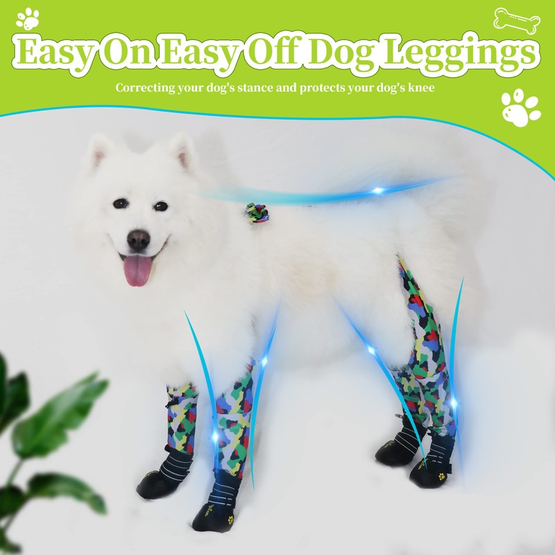 - Easy On Easy Off Dog Leggings: Dog boots and shoes are combined into one, easy to put on and take off, two functions, tested and approved by dogs! Correcting your dog's stance and protects your dog's knee, this dog leggings with boots are designed very comfortable, with 4-way stretch fabric, you can easily slide your dog's walking paws in and out of the leggings without having to fiddle with their sensitive paws