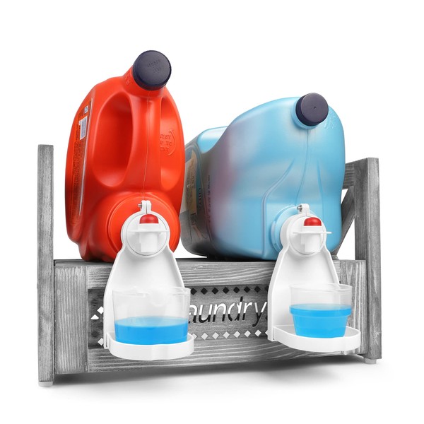 - Fits any Detergent Buckets - Laundry Soap Dispenser Station is sturdy and large enough to hold Two large heavy bottles of laundry detergent at the same time. This rustic grey detergent drip catcher with two plastic detergent drip catchers sits on any flat surface and saves a lot of time and energy from lifting and pouring the detergent into the cup of the washer.