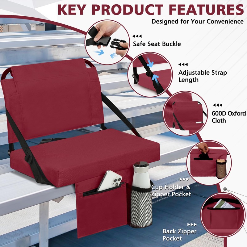 Besunbar Stadium Seats for Bleachers 2 Pack w/Back Support Bleacher Seat Soft Cushion Light Weight Includes Shoulder Strap & Cup Holder, Front & Back Zipper Pocket, Suitable for Sports Events,Maroon