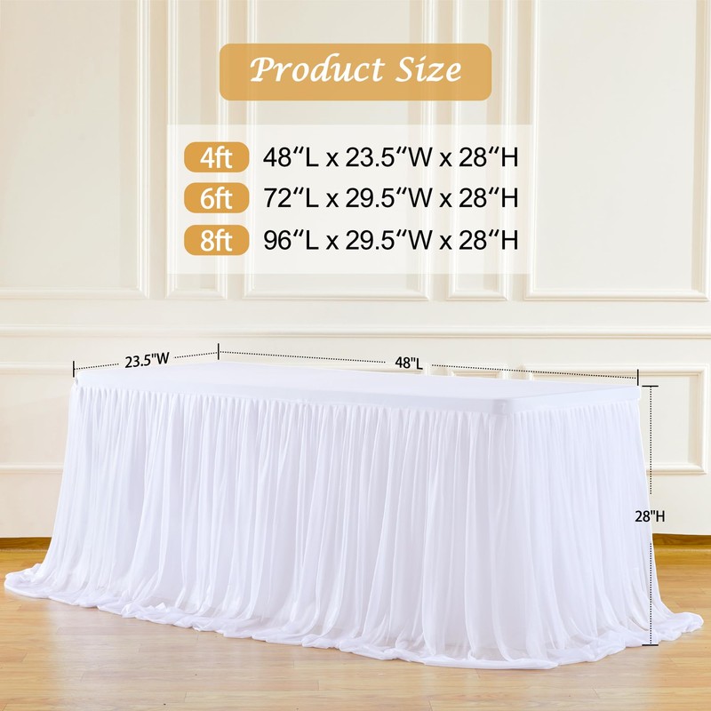 - Three Sided Tablecloth size: Tulle tablecloth have 3 sizes,4ft table cover fit for 48" Length x 24" Width x 30" Height table,6ft table cover fit for a 72" Length x 30" Width x 30" Height table.8ft table cover fit for a 96" Length x 30" Width x 30" Height table. No need to worry about the tablecloth blowing off or falling off.