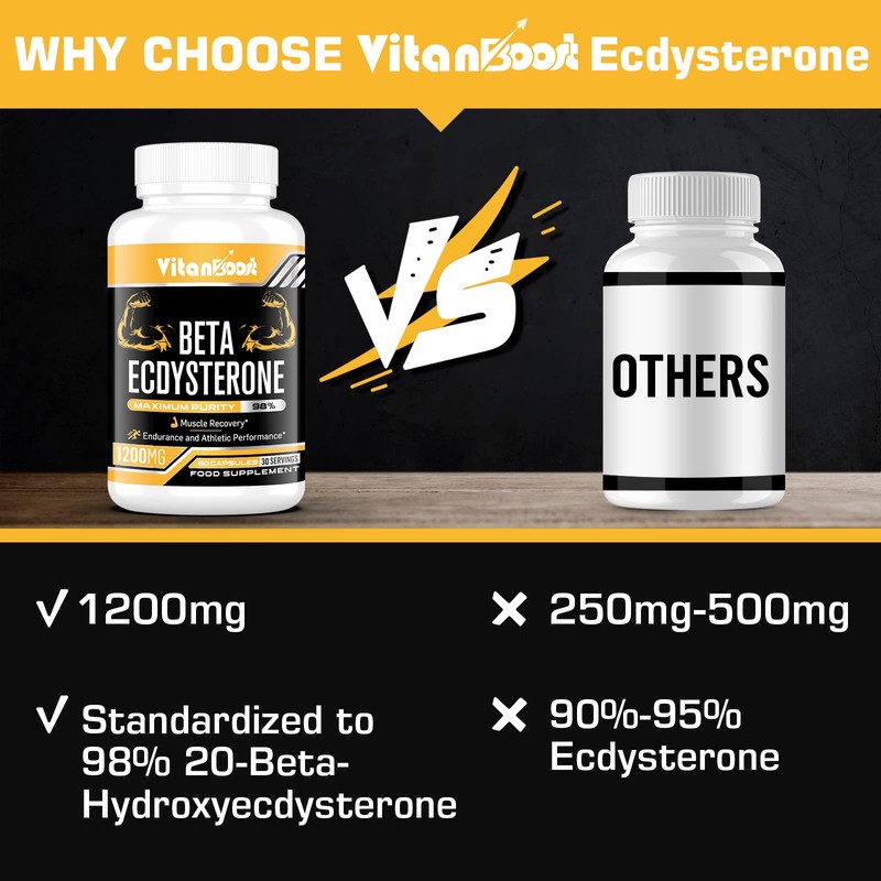 - HIGHEST PURITY BETA ECDYSTERONE FORMULA-Every serving of VitanBoost Ecdysterone formula contains high potency Ecdysterone 1200mg unlike other Ecdysterone which only has 500mg per serving. Our brand boasts the leading 98% purity of Beta Ecdysterone found on the market today, and make you stronger, help you gain muscle mass more quickly than general ecdysterone supplement in 90% purity.