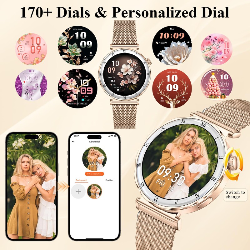 - 👍【Anpassbares Zifferblatt】: Diese smartwatch damen android verfügt über sieben integrierte zifferblätter. Sie können die funktionstaste der uhr drehen, um direkt zwischen den zifferblättern zu wechseln. Die App bietet ihnen über 160 einzigartige online zifferblätter zur auswahl. Die smartwatch damen wasserdicht von unterstützt auch benutzerdefinierte zifferblätter. Sie können ein beliebiges foto ihrer familie, haustiere oder landschaften auswählen und als zifferblattoberfläche festlegen.