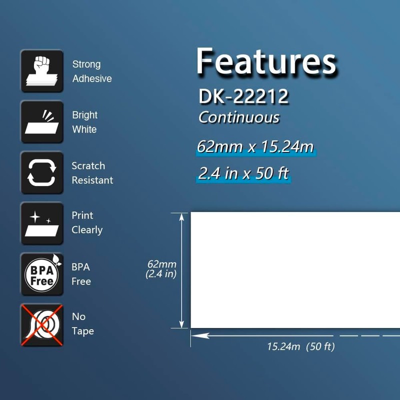 - Specification: 62mm x 15.24m thermal labels, 1 Labels per Roll. Compatible with Brother DK-22212 Pre-Cut Continuous Length Film Labels.