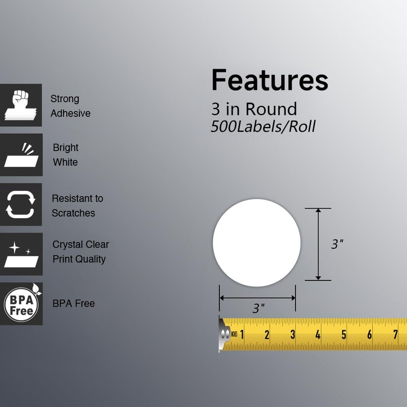 - [ Specifications ]: 3 Inch / 76 mm Circle Labels (500 Round Labels/Roll, 1 Roll),Paper tube diameter:1"(25.4mm). No Ink Toner or Ribbons Needed!