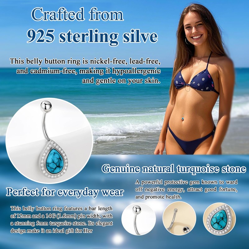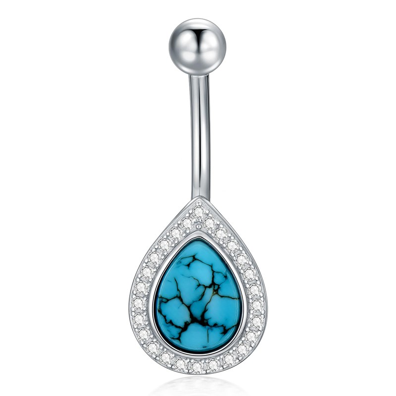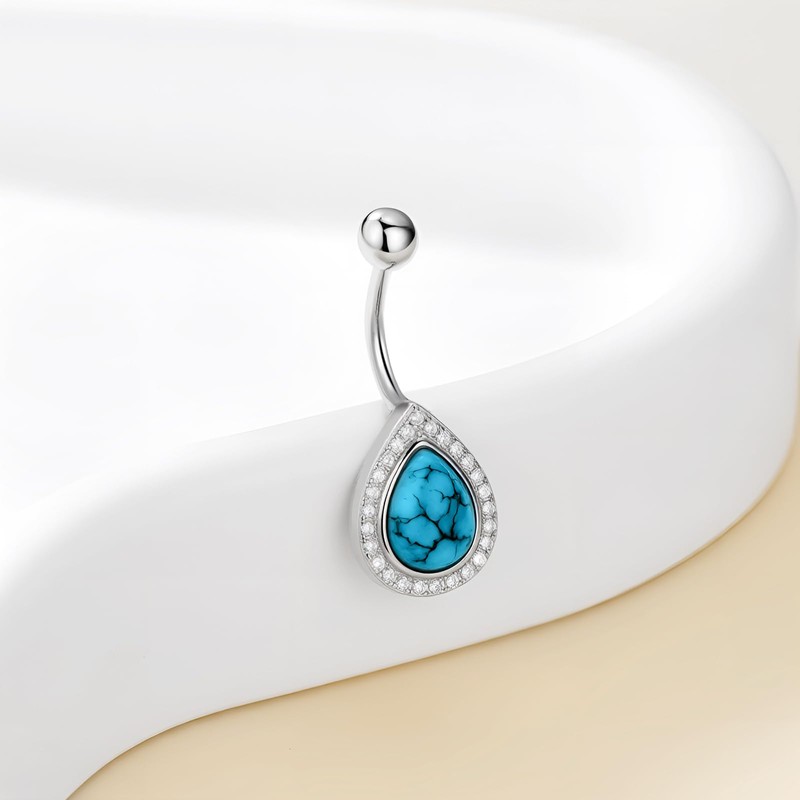 - Elegant Design: This stunning belly button ring features a teardrop-shaped design with a genuine turquoise stone at its center, surrounded by a circle of sparkling gemstones. The natural turquoise adds a touch of earthy elegance, while the gemstone accents enhance its sophistication, making it a perfect blend of nature and glamour for any fashion-forward look.