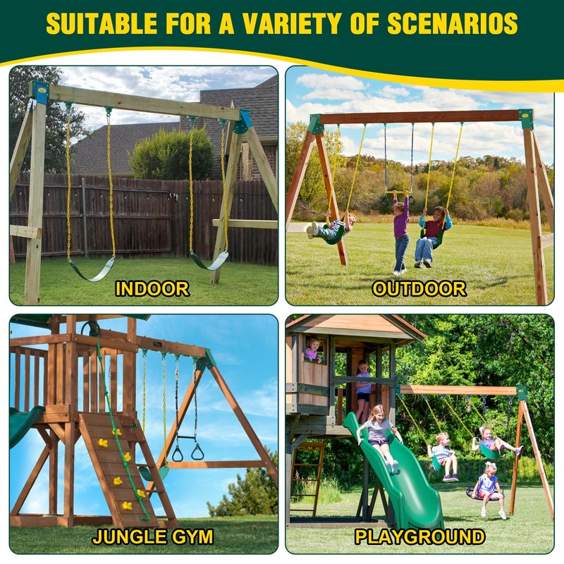 - Rich Accessories: Comes with complete accessories for installing. You will receive a green DIY A-frame swing set bracket and all hardware needed for installation (28 M8 washers, 28 M8*50 hex bolts)and 4 swing hangers,8 mounting screws, 8 washers, 4 oval hooks with locking and 2 swing seats. Widely used for setting up your dream swing set in various indoor and outdoor playgrounds, backyards, gardens, and jungle gyms