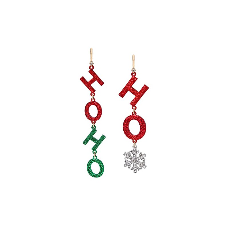 - Merry mismatched earrings featuring festive HO HO HO and snowflake adorned with stone accents. Earrings have a lever back closure. Made from polished metal and glass.