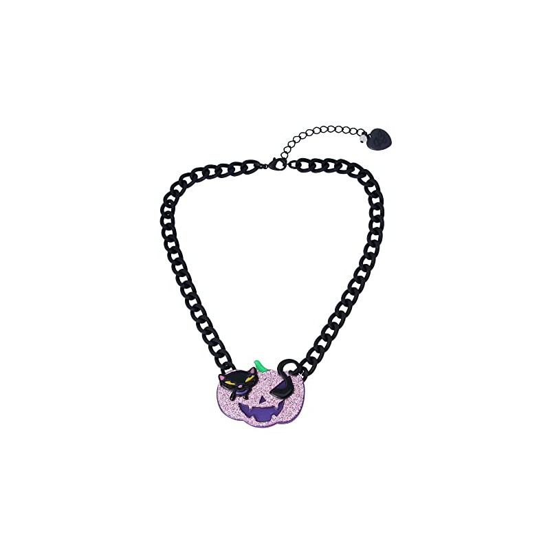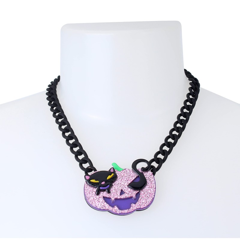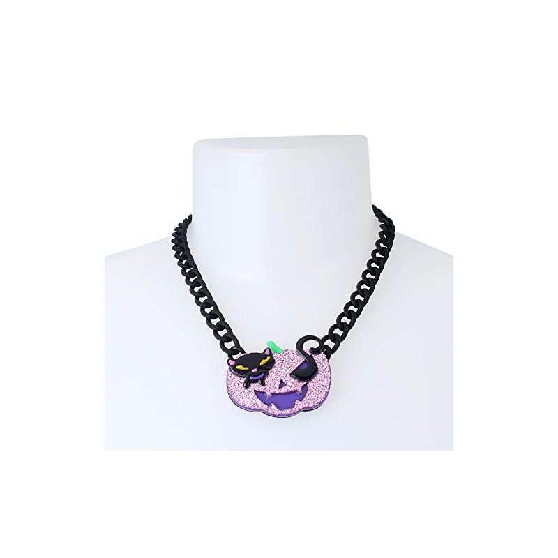 - Striking black chain necklace featuring glistening pink glitter pumpkin pendant with charming black cat peeking out. Necklace has an adjustable lobster clasp closure. Made from metal and plastic.