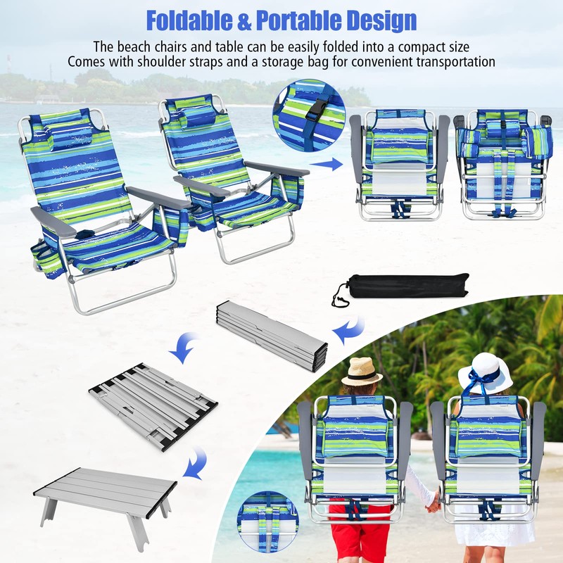 - [3PSC Beach Chair Set]: This reclining beach chair with a small aluminum table is designed for fishing, sunbathing, tanning & camping. You can also enjoy the cool breeze and sunshine on this camping chair. Folding chair is very perfect for indoor & outdoor, including poolside, beach, outdoor music festivals, parks, bay etc.