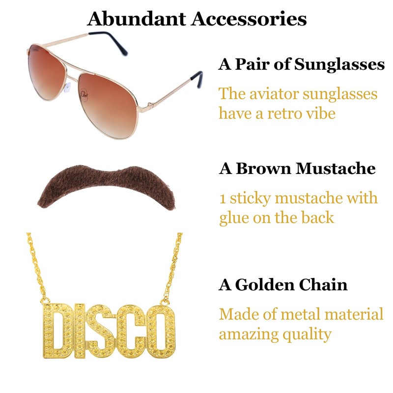 - Package Includes: 1pc Brown Curly Wig + 1pc Brown Mustache + 1 pair of Retro Glasses +1pc Golden Chain + 1pc Wig Cap