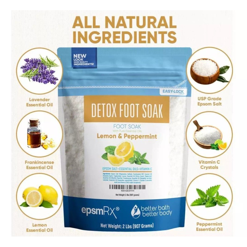 DETOX los pies: disfrute de este “baño de pies de desintoxicación” Mezcla de sal de Epsom por Better Bath mejor cuerpo; Todo natural de grano fino USP sal de Epsom: se disuelve rápidamente en el baño de agua y ayuda a aliviar molestias y dolores Naturalmente; Incluye 4 aceites esenciales Certificado Puro: limón, menta, incienso, lavanda y aceites esenciales - Todos los terapéuticas aceites esenciales puros certificados para los máximos beneficios de aromaterapia; Cristales de la vitamina C: Incluye también los cristales de vitamina C pura que, naturalmente, neutralizar el cloro y amoniaco en el agua del baño; Hecho en los EE.UU.: Hecho a mano en San Diego, California Desde todos los ingredientes naturales de origen ético de sus orígenes directo por todo el mundo Todos nuestros productos estan en inglés SKU 4091922347