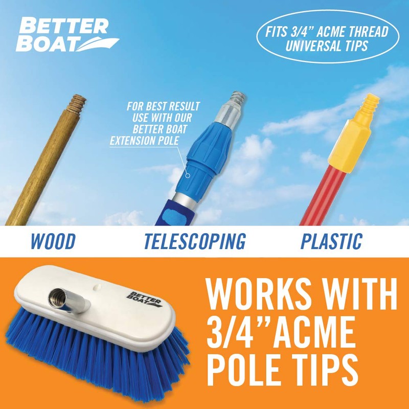 - 3/4” ACME THREAD FITS MANY UNIVERSAL POLE TIPS: Our boat deck brush head can be used with our Better Boat Extendable Rod, and other telescoping handles , a standard broom handle or rods that fit a 3/4” acme thread. Can be used with water alone or boat cleaning products to remove dirt and debris from a boat deck, hull or galley floor. Our boat cleaning brush safely cleans various surfaces including fiberglass, wood, grout, tile, metal and glass. Our marine scrub brush works all over your boat.