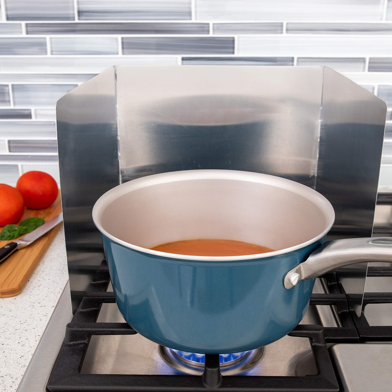 • The convenient aluminum shield has three hinged panels that adjust to fit any size burner or pan