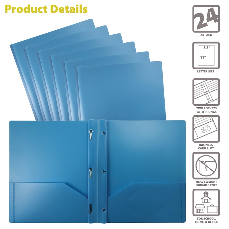 Better Office Products Light Blue Plastic 2 Pocket Folders with Prongs, 24 Pack, Heavyweight, Letter Size Poly Folders with 3 Metal Prongs Fastener Clips, Light Blue