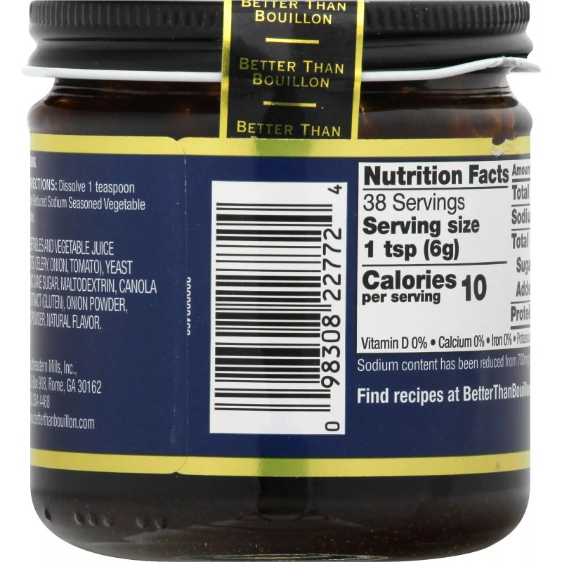 Reduced Sodium Better Than Bouillon Seasoned Vegetable Base is made by combining pureed carrots, celery, onions and tomato and aromatic seasonings26% less sodium than our regular Vegetable BaseEach jar makes 9.5 quarts of broth & contains 38 servingsBlendable bases easily spoon right out of the jar and let you add as much, or as little, flavor as desiredFrom marinades, glazes and vegetables to soups, sides and slow cooker dishes, Reduced Sodium Better Than Bouillon Vegetable Base adds flavor to all your favorite dishes