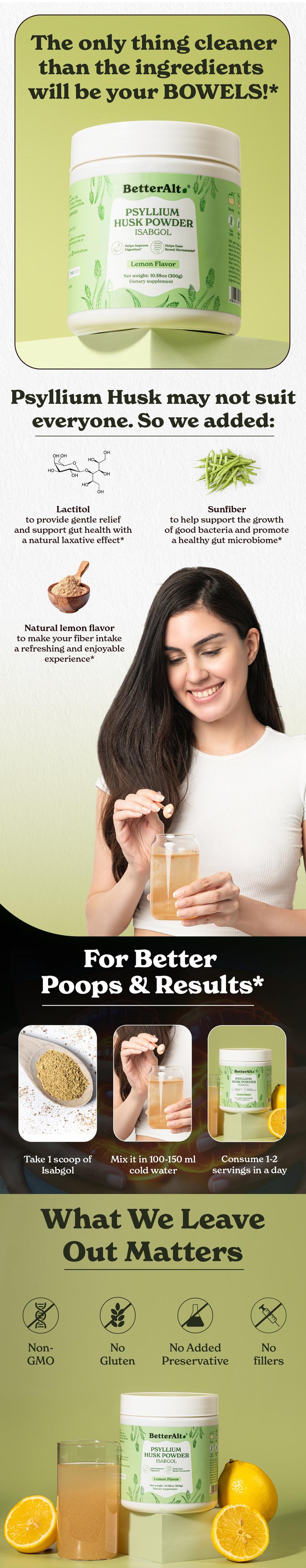 BetterAlt Psyllium Husk Powder | Isabgol | With Lactitol & Sunfiber | Lemon Flavor | Helps Promote Metabolism & Digestive Health | 1-Month Pack