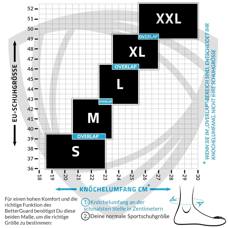 - SIZES - BetterGuard Ankle Brace is available in various sizes from S to XXL to meet the needs of virtually any foot and ankle size. Use the shoe size as an approximate value and measure your ankle circumference for the best fit. BetterGuard is designed to fit snugly and thus provide the best support. If your measurements are close to the maximum size range, we recommend you choose a larger size for comfort reasons.