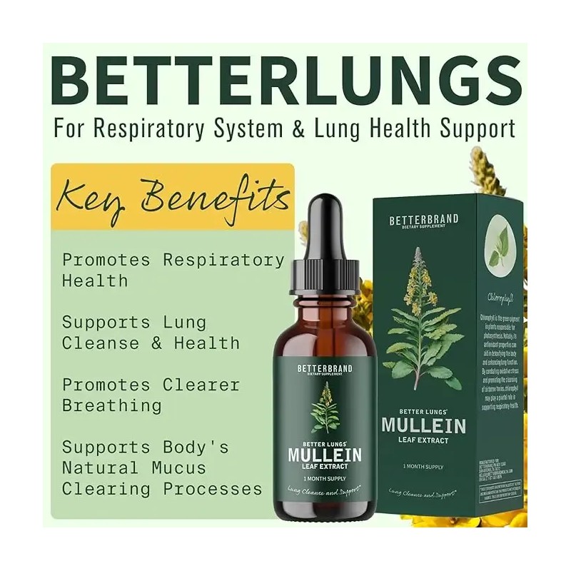 •MULLEIN LEAF LUNG SUPPORT - BetterLungs taps into the natural properties of Mullein Leaf Extract, a traditional herbal known for over centuries for its powerful benefits in respiratory tract and overall lung health. Experience easier breathing, improved lung function, and a renewed sense of vitality.