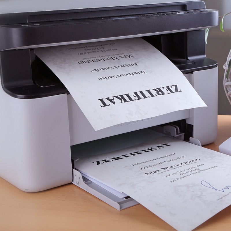 Elegant marble paper in DIN A4 format is ideal for all standard copiers, laser printers and inkjet printers. The marbled universal printer paper is also ideal for labelling by hand with a fountain pen or a calligraphy nib. The 200 g/m² premium paper used gives the necessary strength and has a very pleasant feel. With the marble paper from Betterpress it is basically possible for you to create certificates, certificates, menus, certificates, menu cards or awards in professional quality. Box contents include 50 sheets in DIN A4 format. Ideal for associations, clubs, schools, anniversaries, birthdays, weddings or corporate events. Presented in resealable packaging - so your remaining sheets remain protected. Made in Germany, without company impression on the front or back. The marbling is on both sides. Strong design with a weight of 200 g/m².