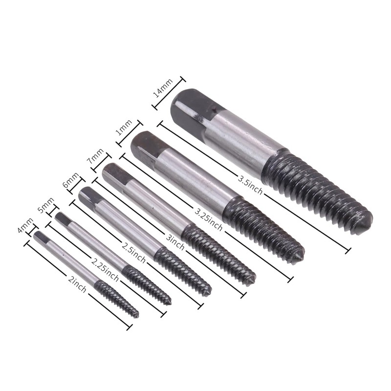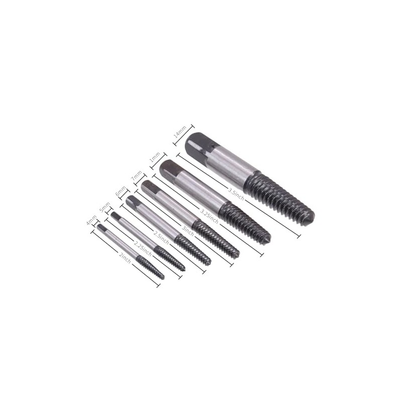- SIZE - The screw extractor drill bit set in 6 different sizes to meet varied needs. ; They are 3/4"-1", 9/16"-3/4", 7/16"-9/16", 5/16"-7/16", 1/4"-5/16", and 1/8"-1/4". The full broken screw extractor comes in a molded plastic storage case.From water pipe disassembly to security bit repairs, this bolt extractor set ensures you have the right tool for every job, no matter how niche.