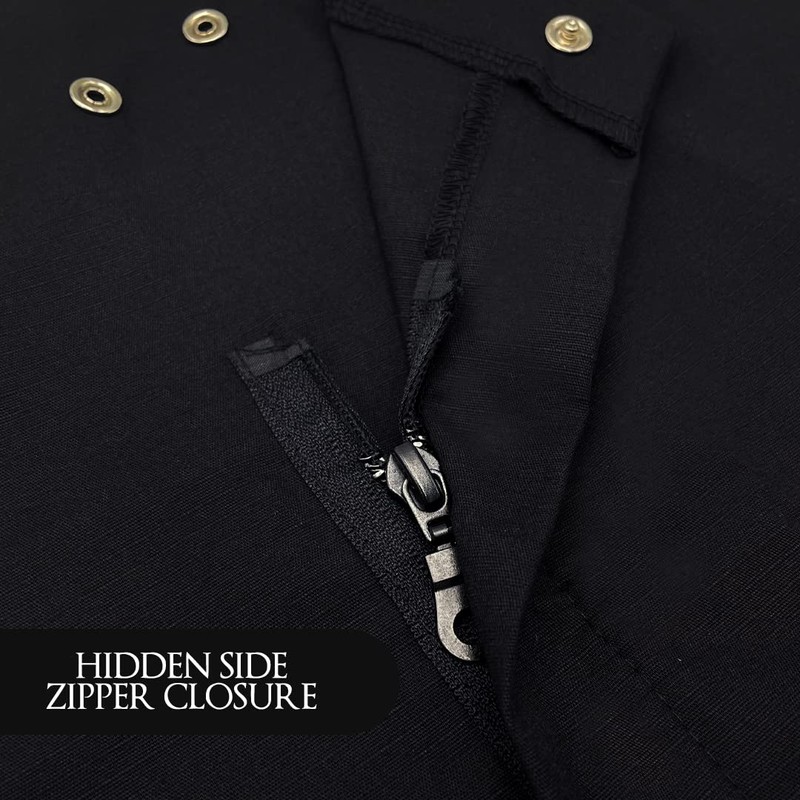 - CONCEALED SIDE ZIPPER CLOSURE: Includes a single chest pocket on left breast and a convenient offset, concealed side zipper closure. It is designed with a band collar, short sleeves, and shoulder snaps. This jacket comfortably holds all of your styling tools, with easy accessibility!
