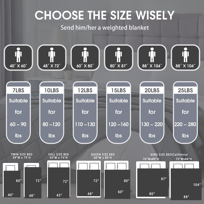 - SHOPPING GUIDE: Heavy blankets are available in 40"x60"throw size for kids,48" x72"twin size, 60"x80"queen size, 80"x87"king size, 104"x88"california king size, with 12lbs, 15lbs, 20lbs&25lbs weighted blankets respectively. You can choose freely according to your own needs, give you a variety of options.