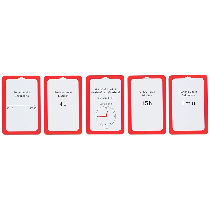 How late is it? The cards indicate arithmetic tasks over time. For example, the time must be calculated in countries with different time zones.