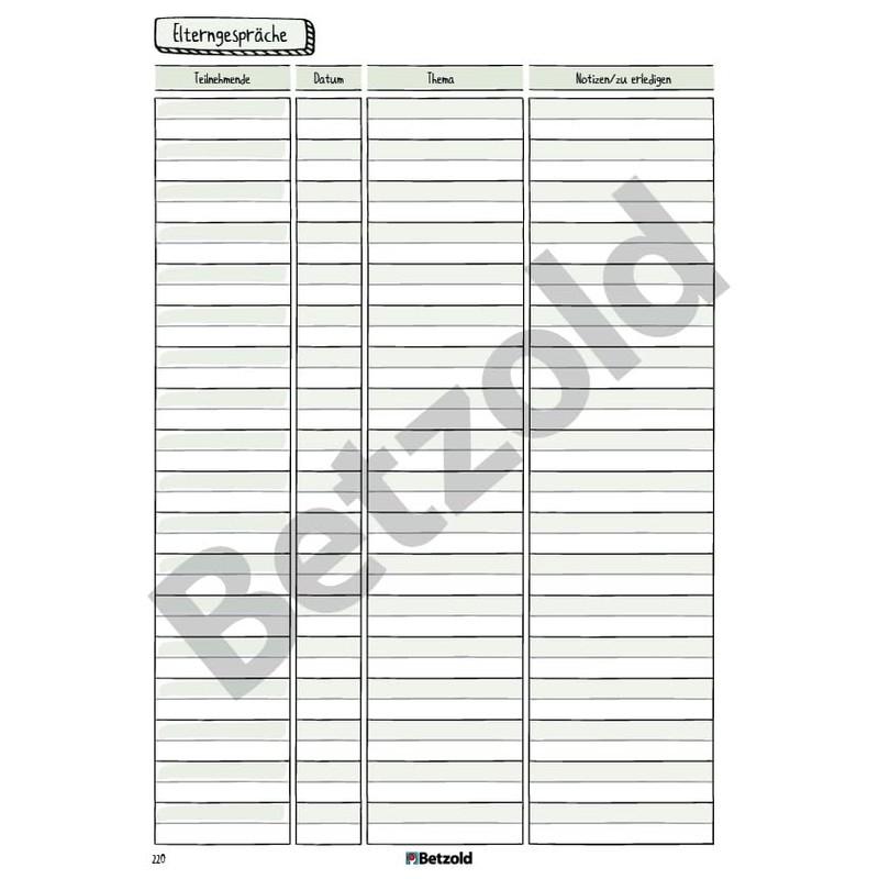 - COMPREHENSIVE CHECKLISTS: With lists for parent meetings, materials and representation lessons, the Betzold design planner is a practical tool for your turbulent school life.