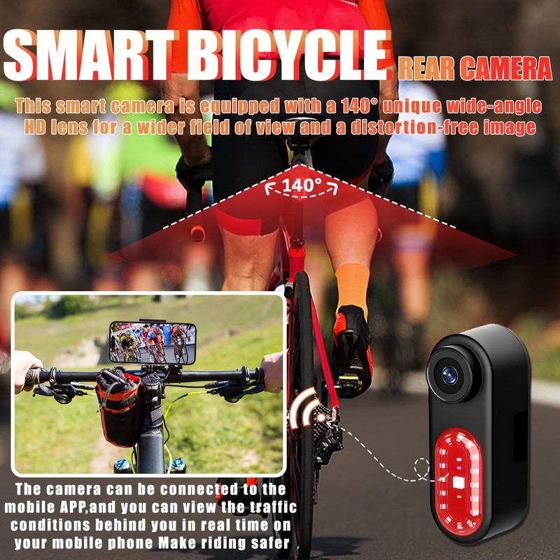 - WIDE-ANGLE HD REAL TIME VIDEO: The 140° wide-angle lens delivers crystal-clear 1080P footage with minimized blind spots. At the same time, this bicycle rearview camera will also continue to record through the loop recording function, while capturing breathtaking scenery along the way.Bicycle Tail light senses braking or vibration while riding and displays on high for five seconds, This makes for a more enjoyable, carefree experience