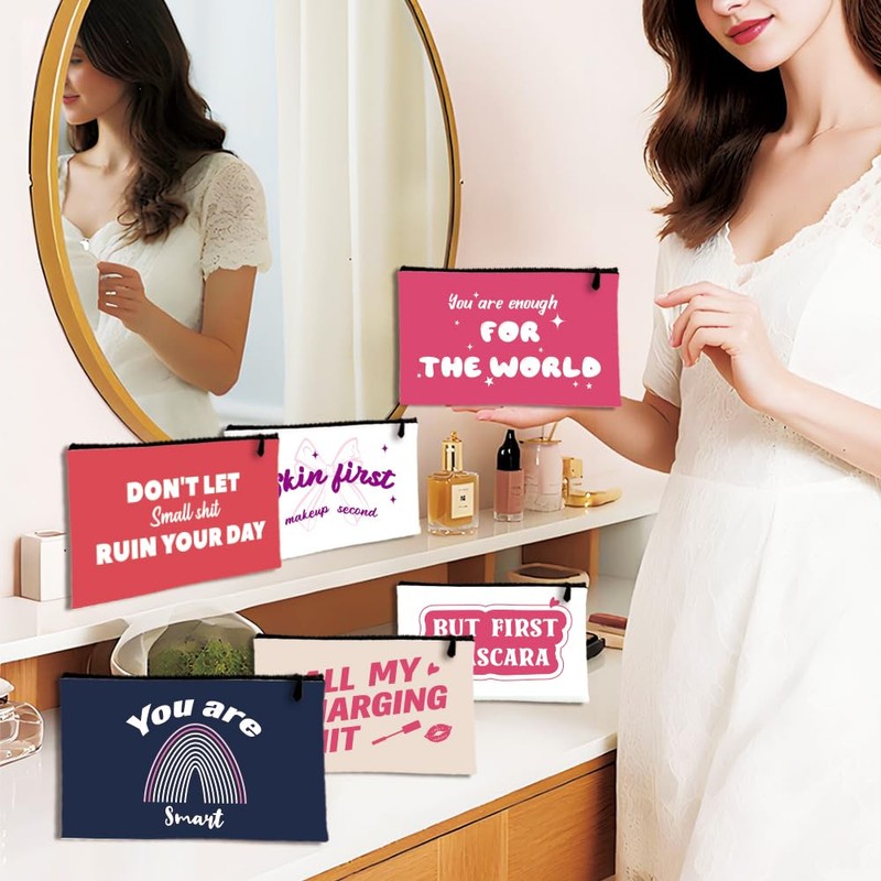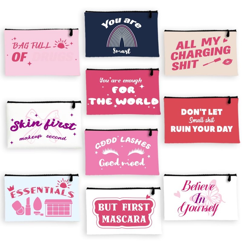 BEUNITONE 10 Sets Canvas Makeup Bags Multi-Purpose Travel Bulk Cosmetic Bags Toiletry Organizer Pouch with Zipper Multicolor Fun Inspirational Text Patterns,9.8X5.2 Gifts