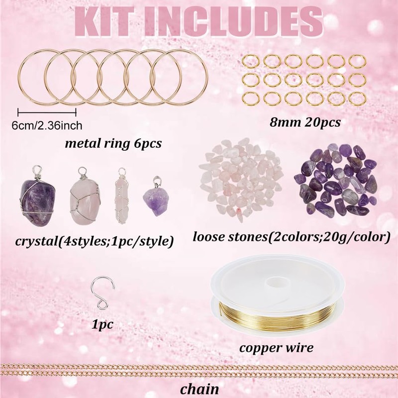 - Including: The Suncatchers set includes S Hook 1pc, Chain*1pc, Jump Rings*20pcs, Copper Wire*1pc, Round Rings 5cm*6pcs, Cristal 4 types each 1pc, Cristal 2 colors*20g. Includes everything you need.